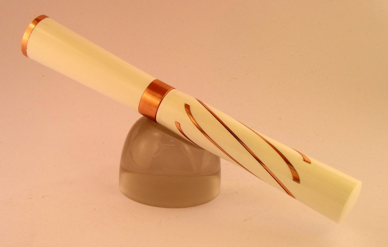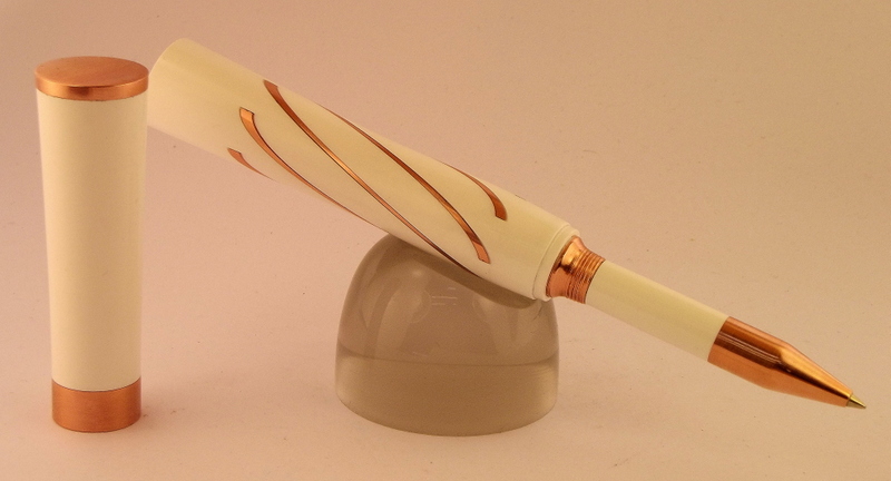 A rollerball with white PR with copper metal bits.