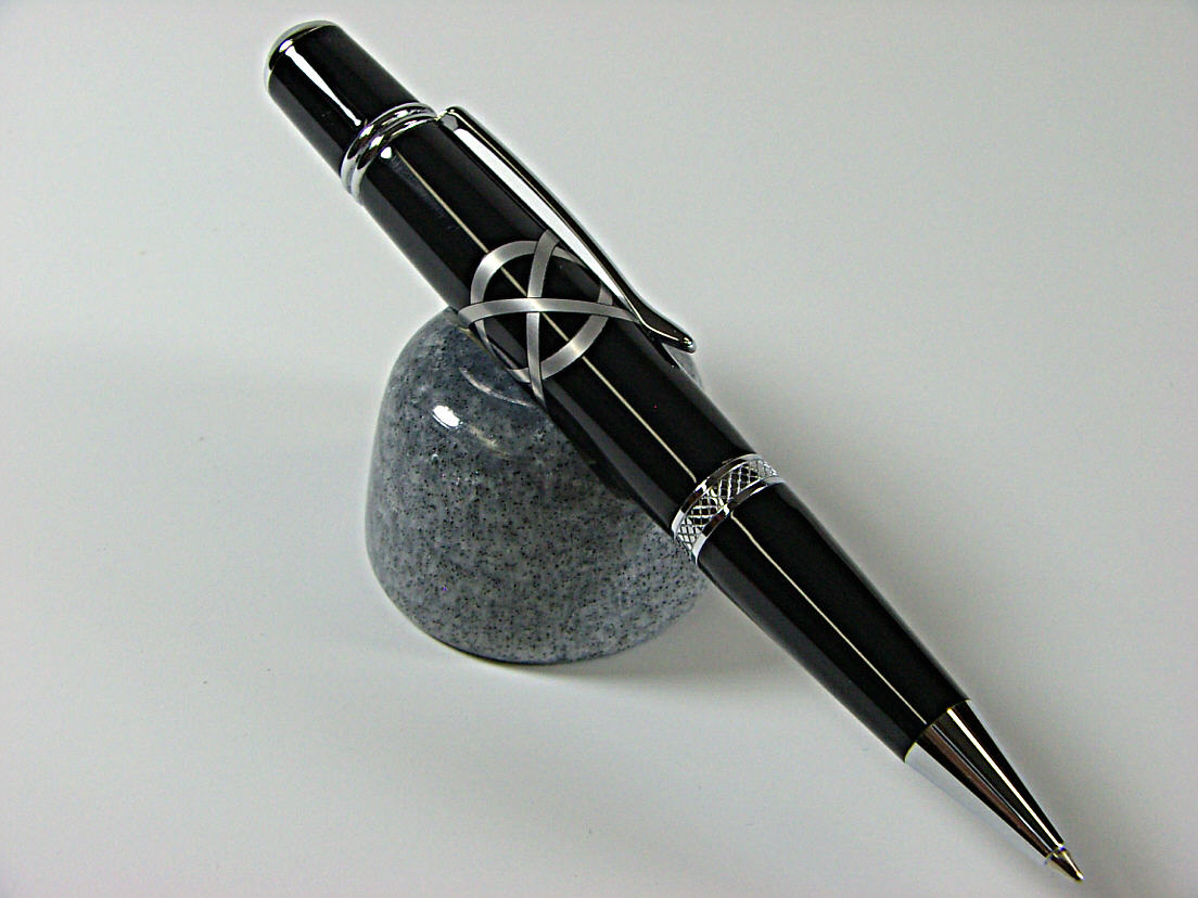 The next reason I tint epoxy is when making segmented blanks. I will match colors usually white or black or red with the color of materials used. This is sort of a fill in case there is any gaps in the segmenting. I will give you an example. The pen I shown here is black acrylic and aluminum knot. I glued the aluminum in with black tinted epoxy and you probably can see the edges of the metal have the hint of the black epoxy. It works well.