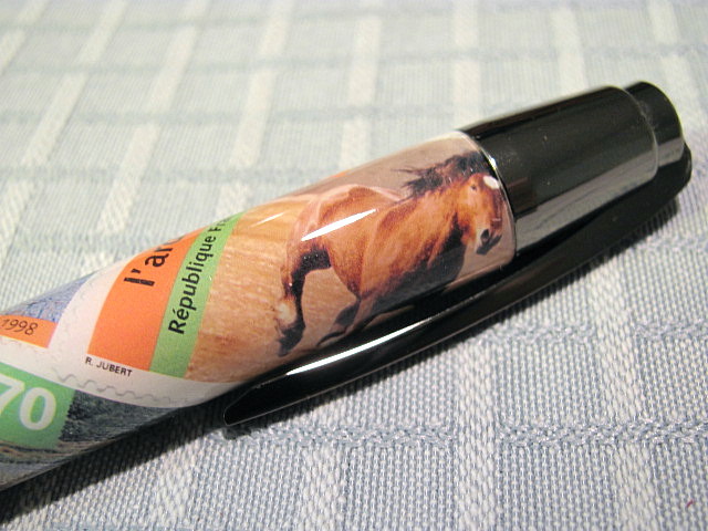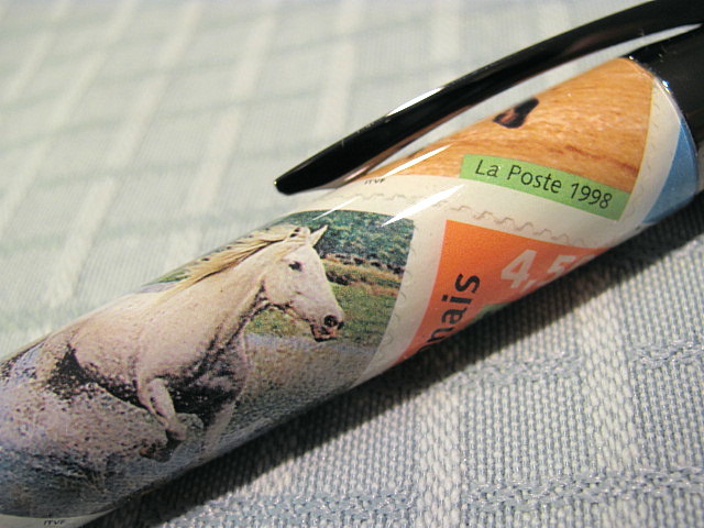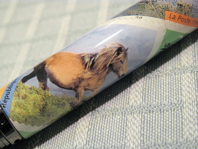 I loved the look of these stamps from France,and ended up doing it decoupage style since the next one up had stamps too large to fit on a bare tube.I love wild horses.I hope someday some horse lover will want it.