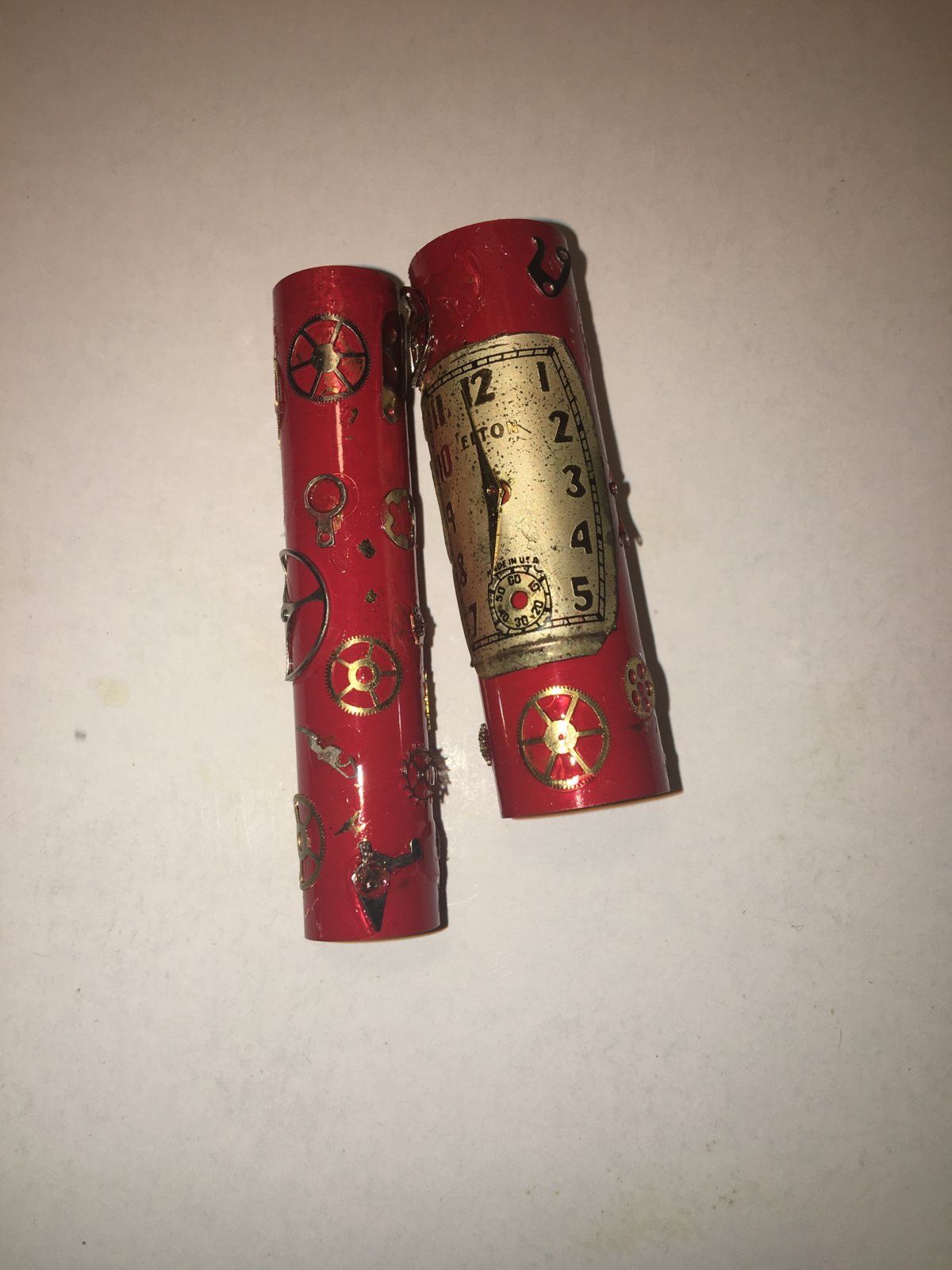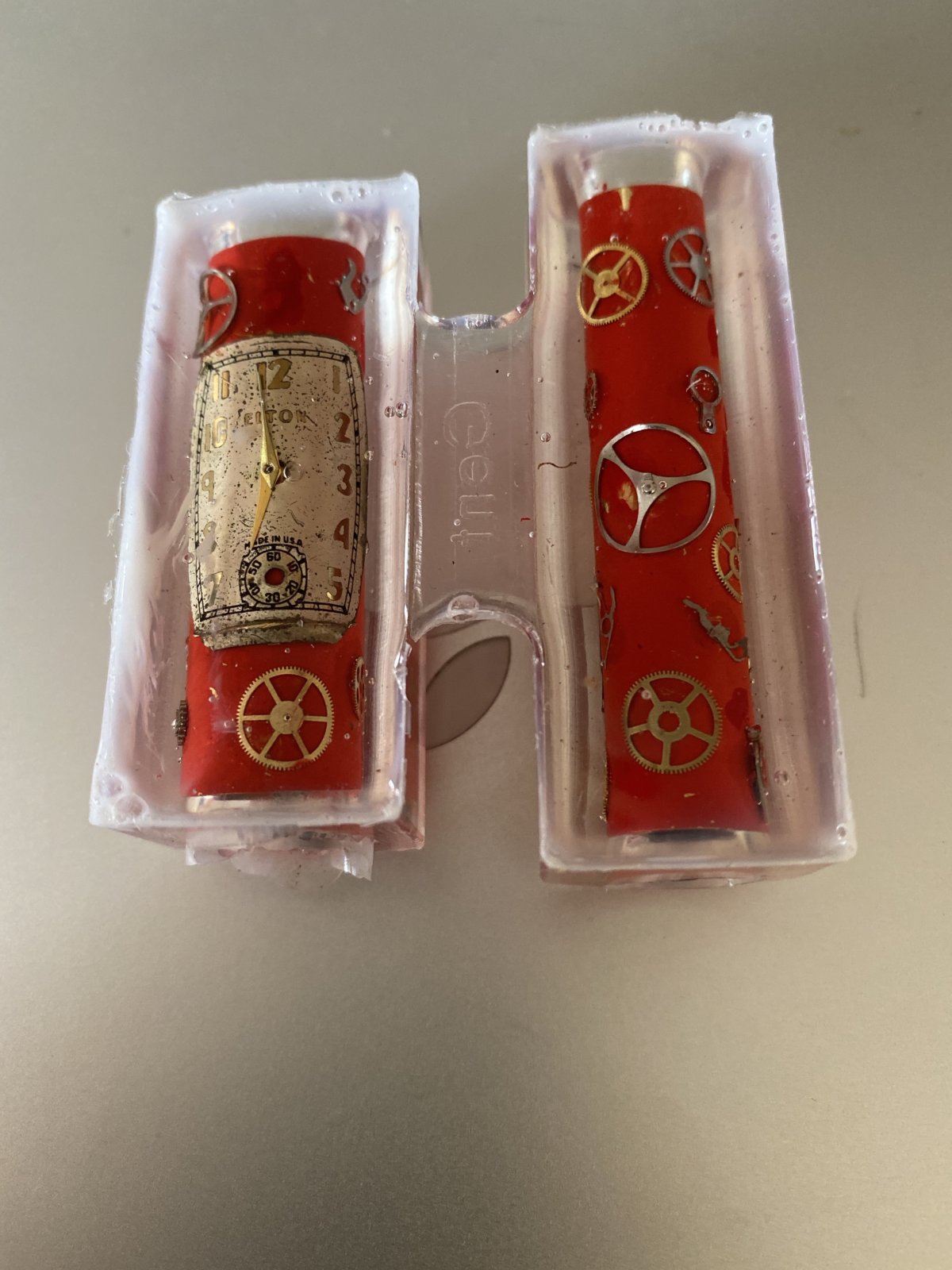 Created the blanks (first photo) at MOVPTG last month under Ernie Boraga's tutelage. Cast them last night using Alumilite Clear. Could not get the pressure pot up to normal pressure (50 PSI); would only get to ~20 PSI. Let is cook for 5 hours +. When I took the blanks out of the pot they seemed to be OK (second photo). Will know for sure when I turn them once the hardware (from Turner's Warehouse) arrives. Film at eleven.