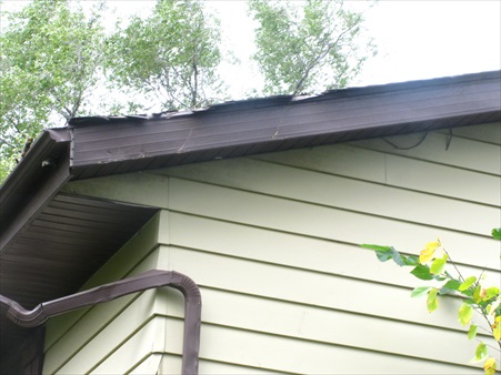 Too bad about your deck ! . Looks like the downpipe needs to be replaced. . And a little damage to the corner on the siding and the roof edge ?