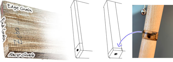 1. I cut a 1/4" thick piece of wenge or zebra and drill a 1/4" hole through the Face Grain.