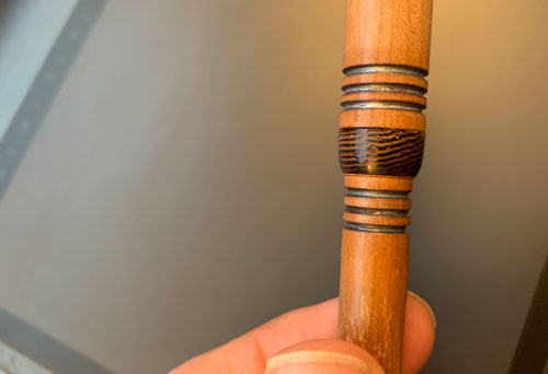 I like using scraps of wood as centerband material, but recently (and accidentally) drilled through the face grain instead of through the end grain of some zebra wood.