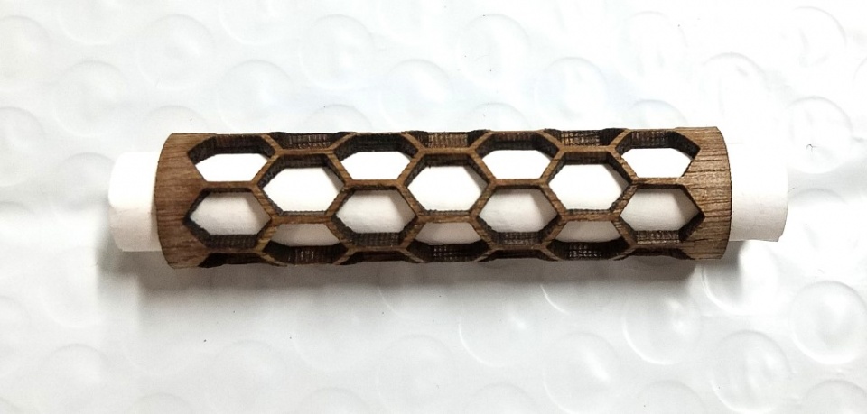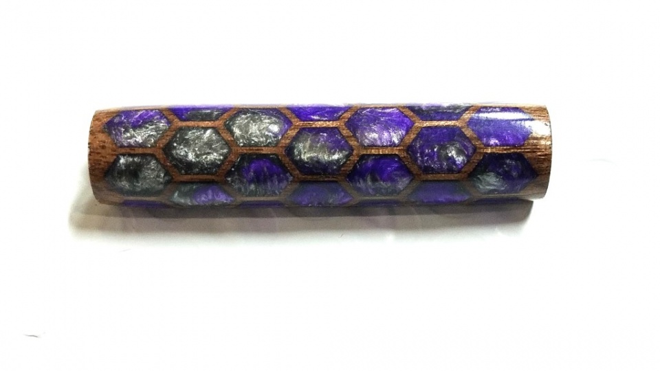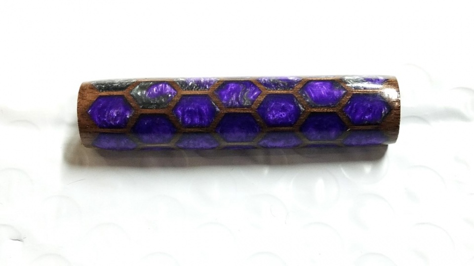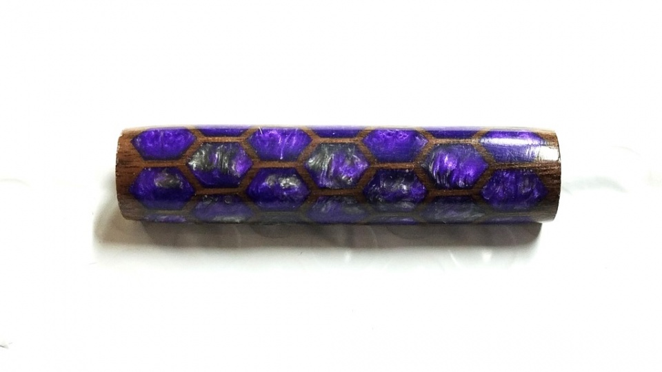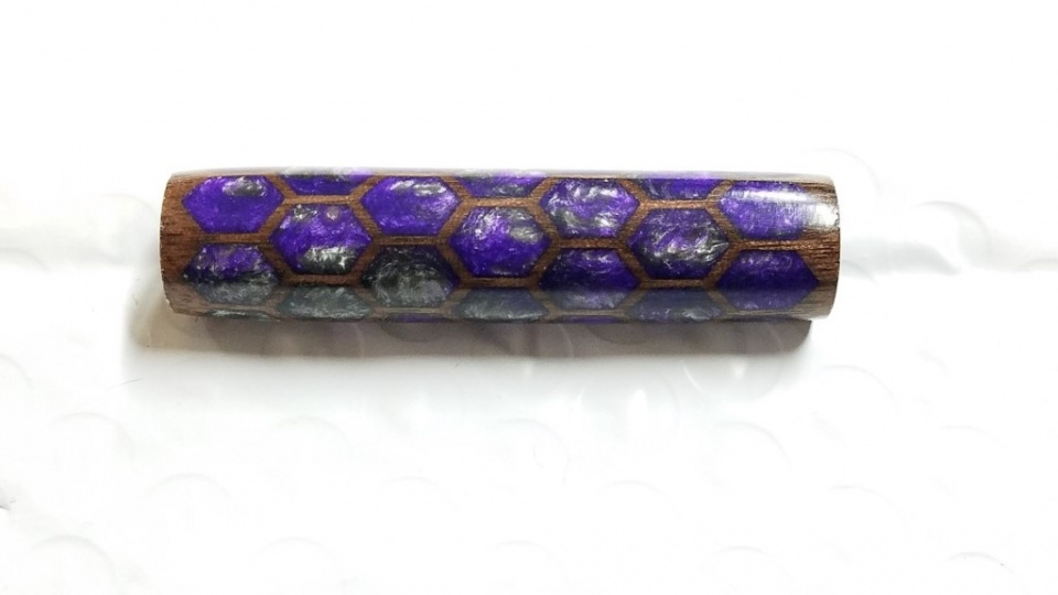This is a wood "skeleton" in a honeycomb pattern from Kenneth Wines that I cast in Alumilite with purple and silver Pearl-Ex. He normally creates a wood inlay blank, but I had an idea that seems to have turned out well. I have several other patterns from him and will be casting those in the near future.