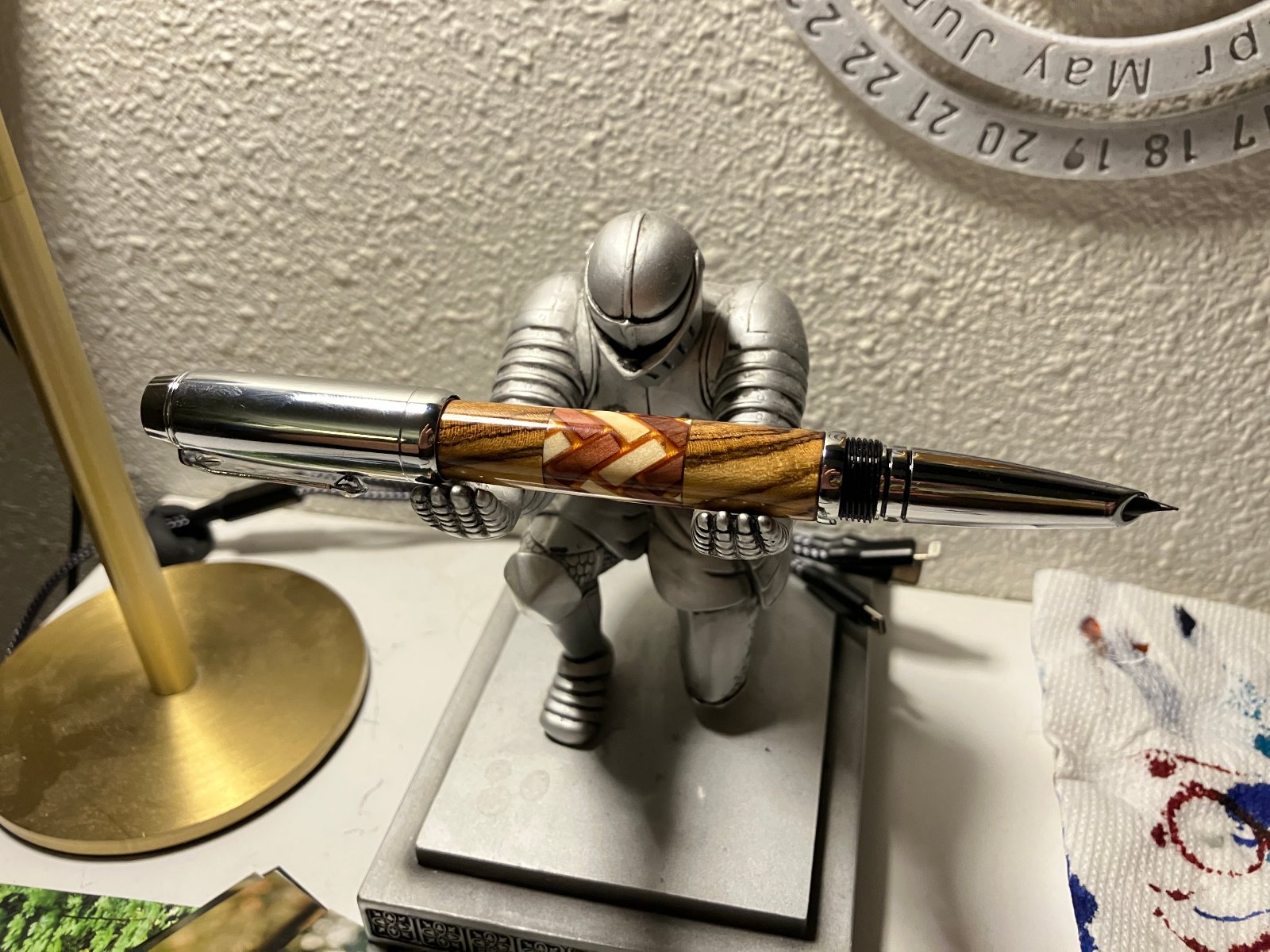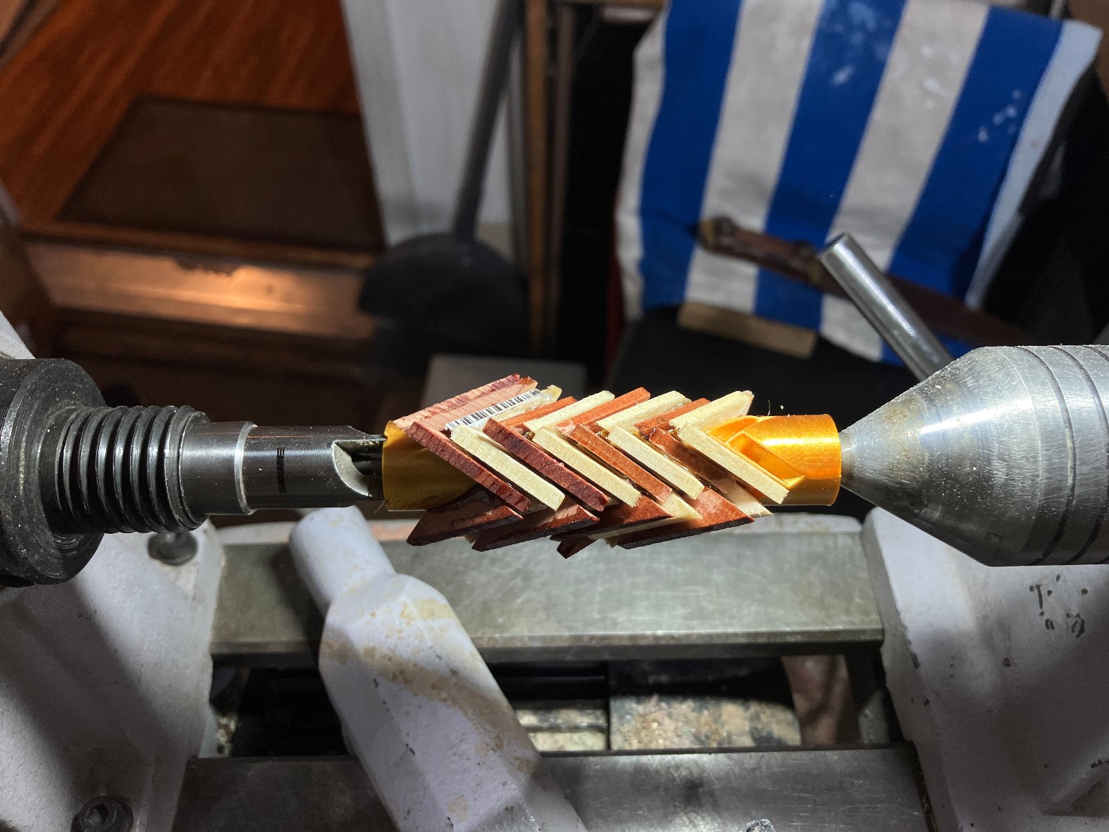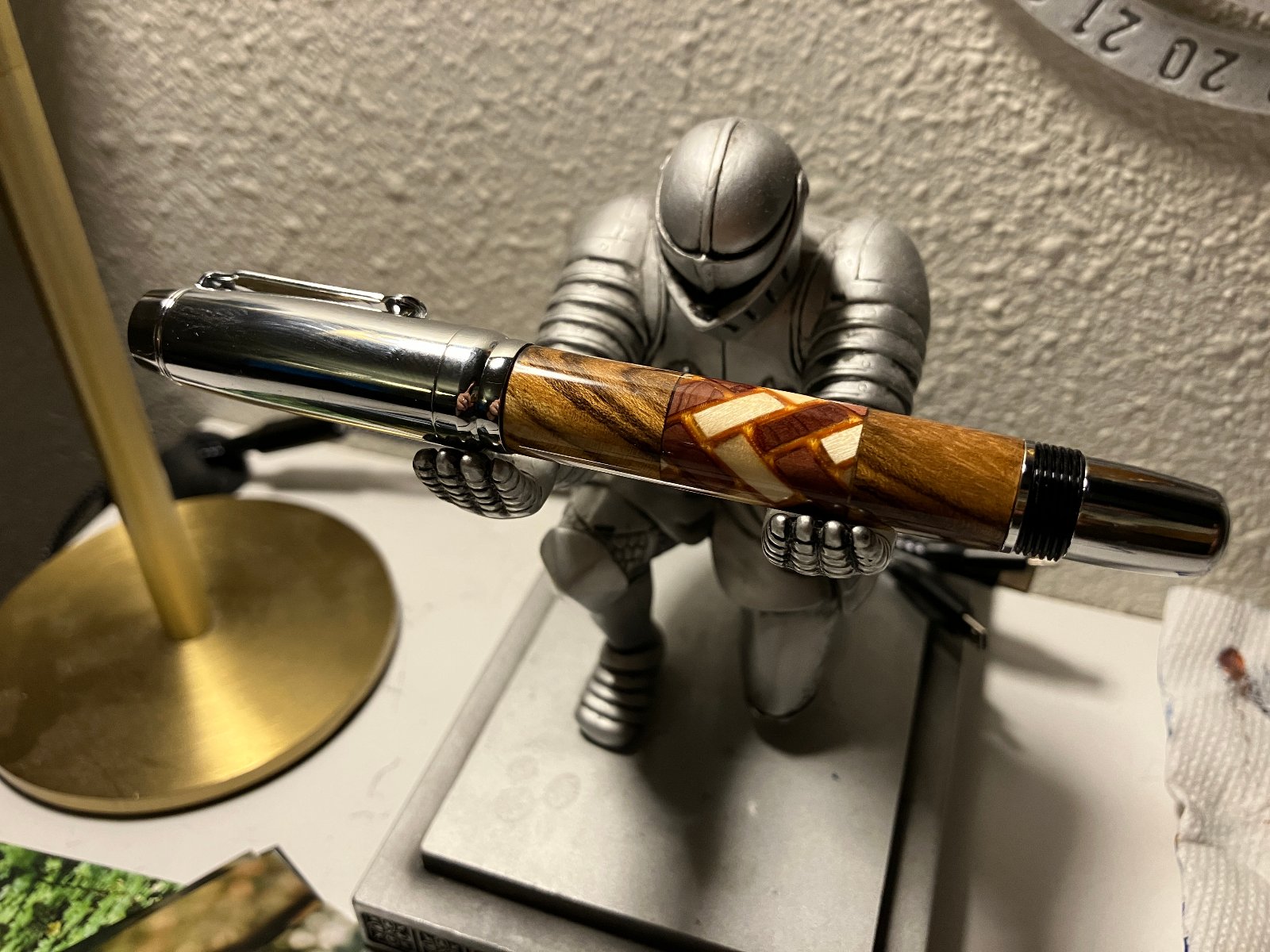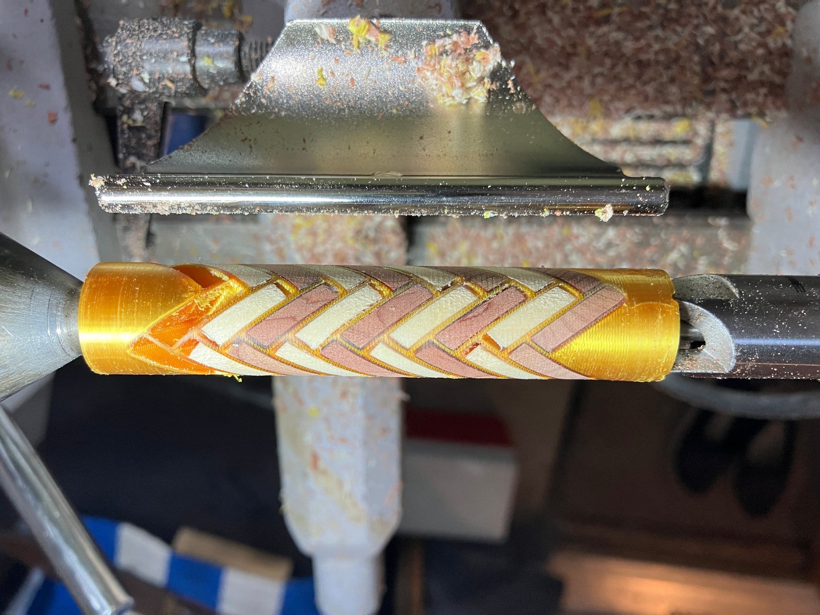 This pen was a bit of a hodgepodge. Trying out a new kit, trying out a new blank making technique (3D printed structure for making 3D herringbone segmented patterns. The herringbone printed structure works great, but my technique for segmenting still needs some serious work. I ended up only keeping the least-gappy piece of the segmented blank and combining it with some diagonal cut bocote. In the end, I have a pen with bocote, cedar, aspen, and faux-metallic gold silk PLA, combined with chrome hardware. Ah well.
