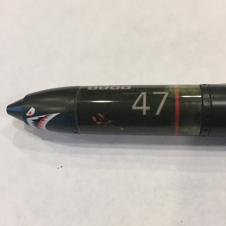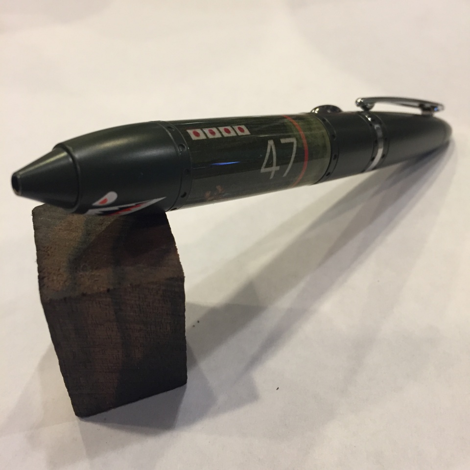 Overall, I am pretty happy with how this turned out. I need to move the flying Tigers logo up a little closer to the "kill" flag markings and I had a little bit of a delamination occur when I had to punch out the threaded inserts you press in to get the nib and rear section threaded in place. I realized too late that the best way to ensure the front nib and the rear section line up properly on the blank is to thread them onto the brass inserts first and then press them into the tube. Lesson learned....