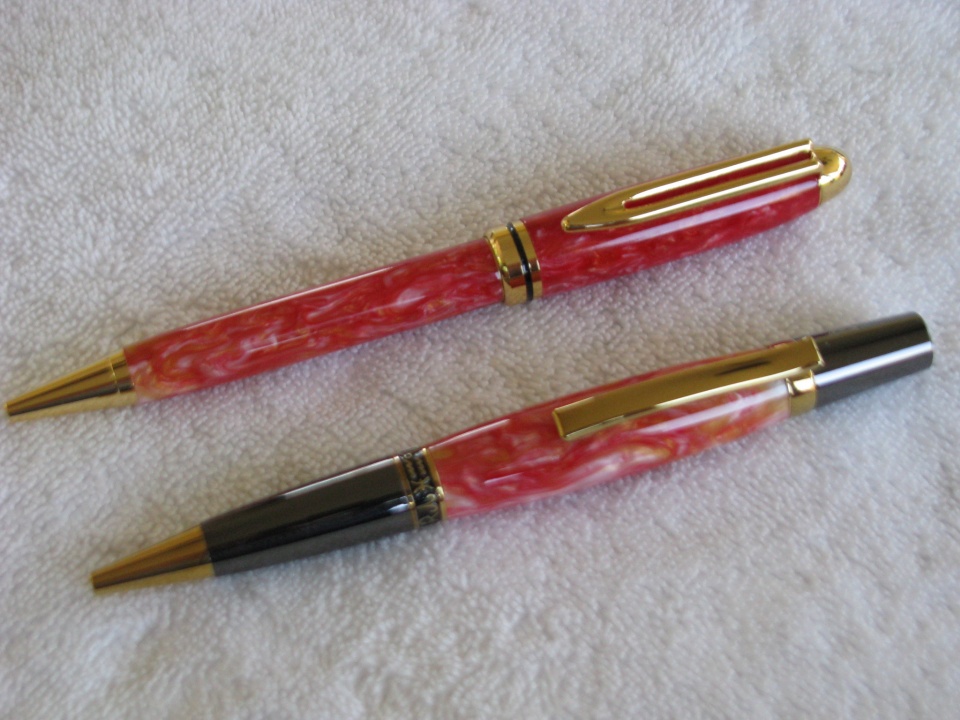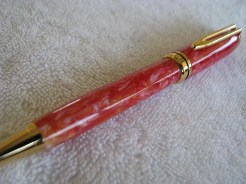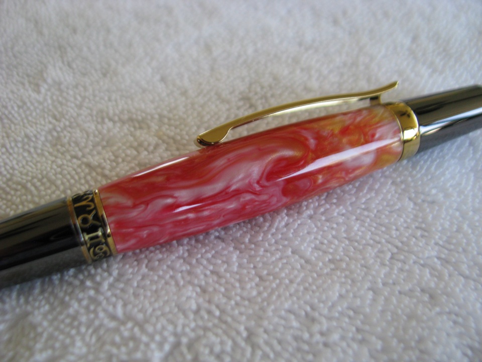 I was asked to make a pen to be used as a raffle item for my upcoming 45th high school reunion. I tried to find a red, gold and white blank to match the school colors but kept coming up empty. I contacted Mike Allen at Woodshed Pen Company and asked if he could help. A few days later a some beautiful custom blanks arrived in the mail and ..... well, lets just say the reunion committee was very happy to receive not 1 but 2 pens for their fund raising activities.