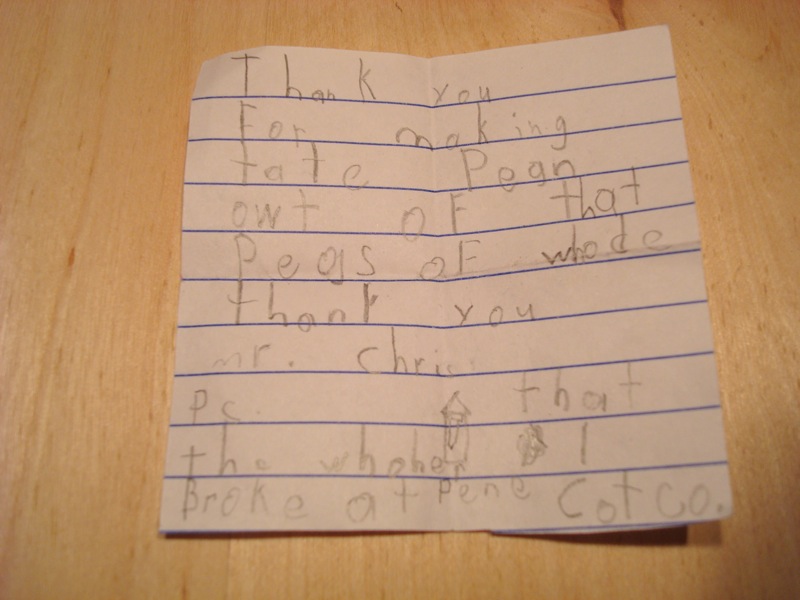 Several months ago at a Costco open house my neighbors daughter broke a board as part of a karate demonstration. I got that board from her parents and made a pen with part of it. Today she came over with this note that she wrote by herself with no help from her parents. She is just 5 years old. I'm going to put this up on my shop wall so when I'm having a bad day I can look at this and smile.