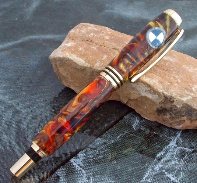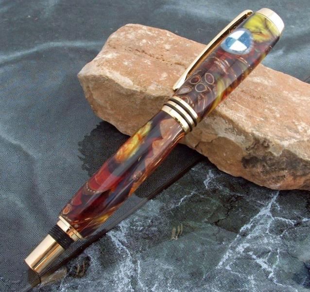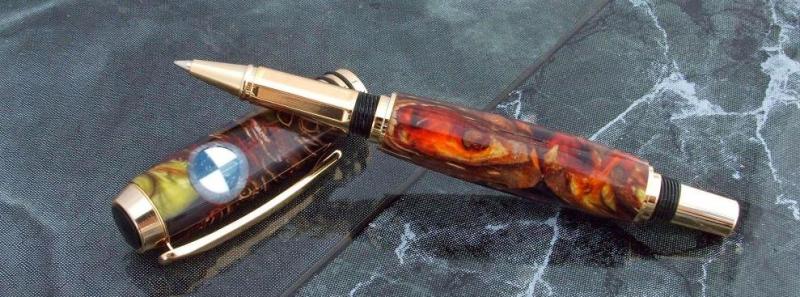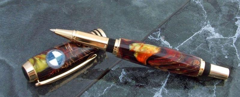 This Tycoon is for a Friend at work, She loves her BMW :banana: so that is the reason for the insert. :rolleyes: She also wanted something with Fall Colors, I had a bunch of pieces of pine cone laying around so I stuck them in a mold and mixed up some ALUMILITE, clear orange and pearl yellow. Then they went in to the PP at 60 PSI so that it would go all the way in to the pine cone. The finish is 10 coats of thin CA, and MM to 12,000.