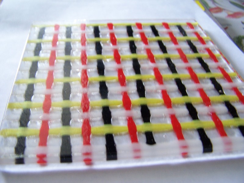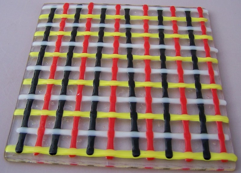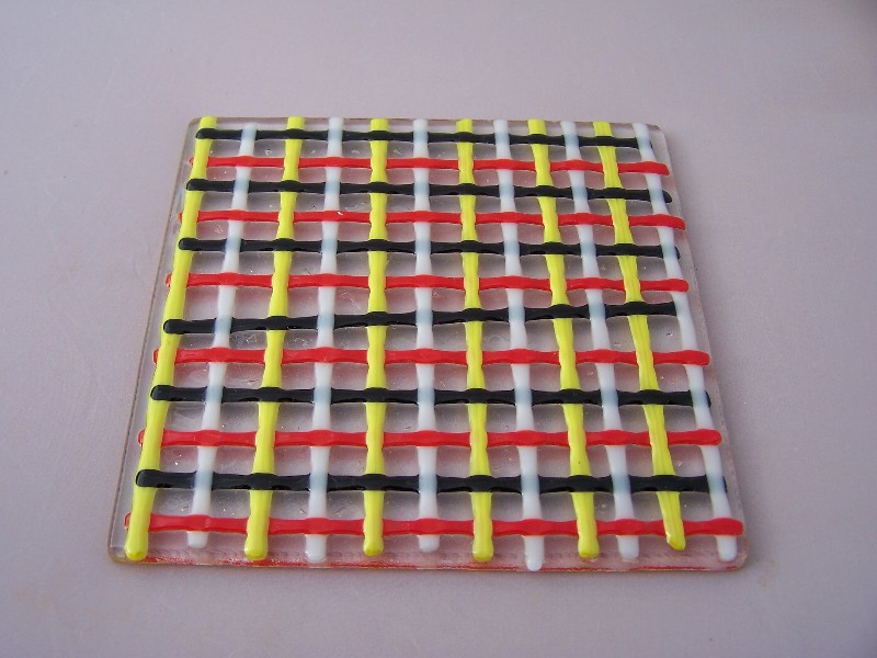 The Trivet is 6in square and the four colours woven and then fused to clear glass.