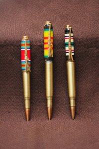 I was very impressed with the Military Pen hornet406 posted a while back. I contacted him about making a WWII Victory Ribbon blank; he quickly made one for me. I also picked up Vietnam and Desert-Storm blanks. I still can not decide which cartridge I prefer … I think the short shell (30-30) on the WWII is my favorite; I think it balances with the size of the blank. The other two are on a .223 shells. Thanks for looking … comments / suggestions will be appreciated.