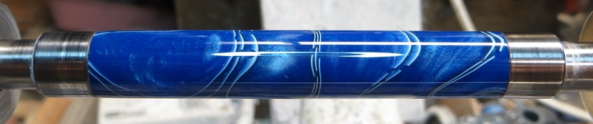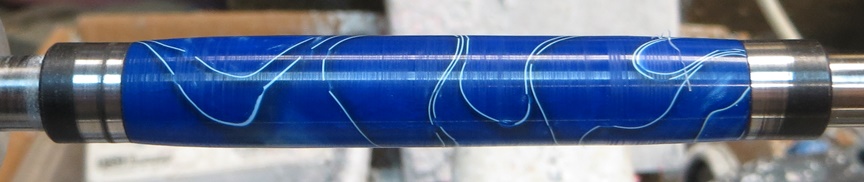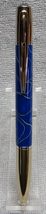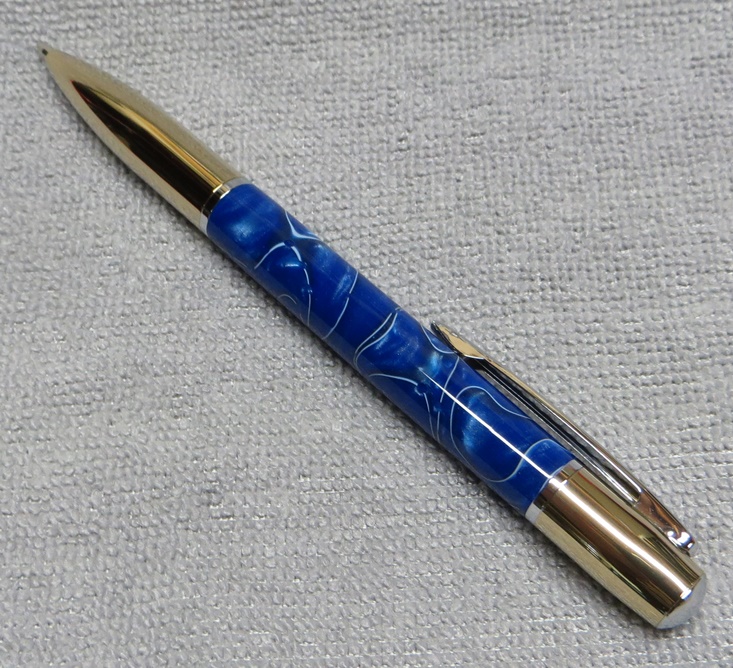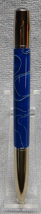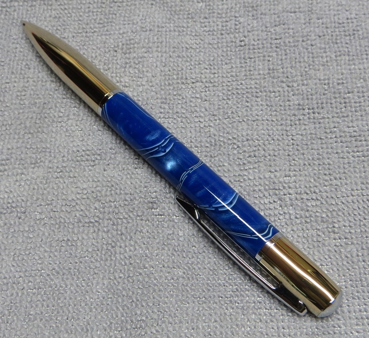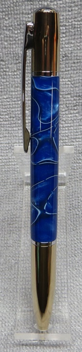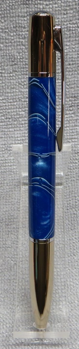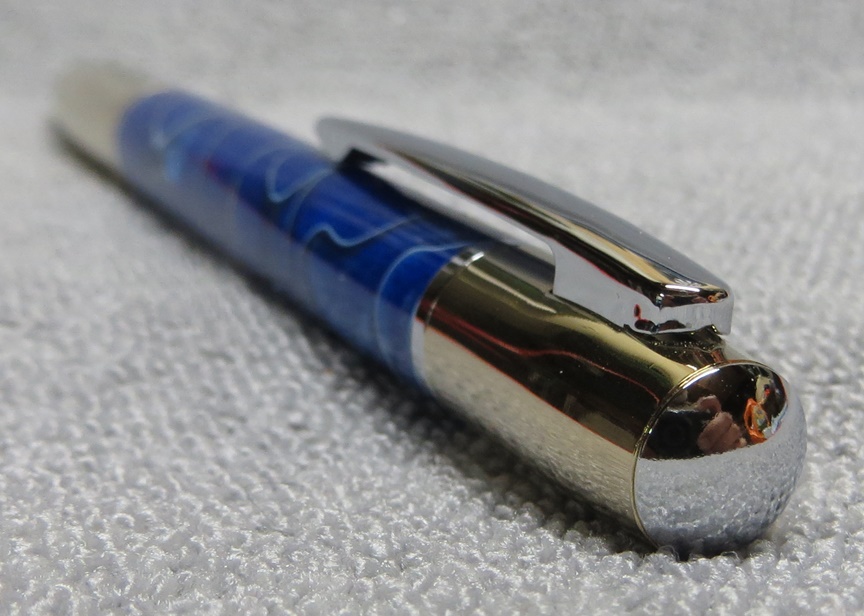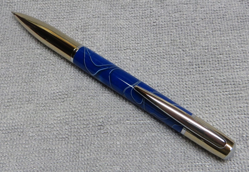 This is a new Berea kit called the Yari, that I purchased from Exotic Blanks. The finish is called Hardite and Chrome. Hardite is apparently a new plating for Berea. The blank is an acrylic from Exotic Blanks, called Hawaii Blue Mesh. I really like the blank and the shape of the pen.