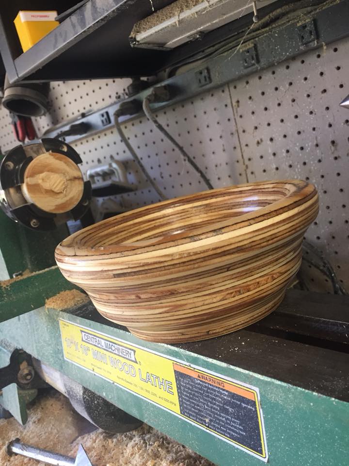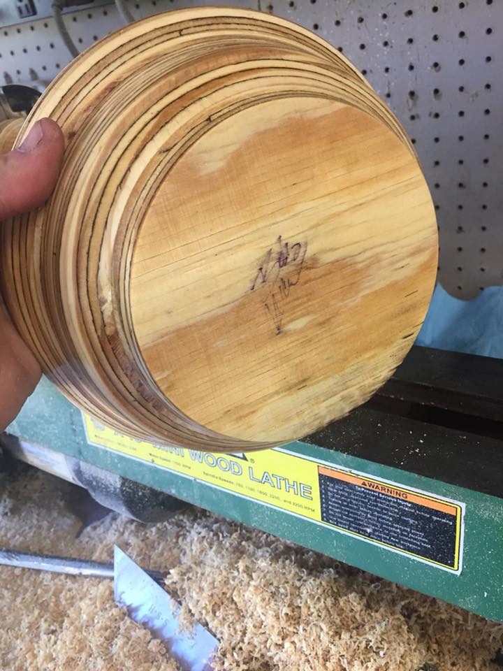 This on was 3 slices at about 9 inches round that I glued then 3 in 6 inch and 4 in 4 inch then I did a second glue that glued the 3 sizes together. I want ot say it was 3/8 cheap plywood.