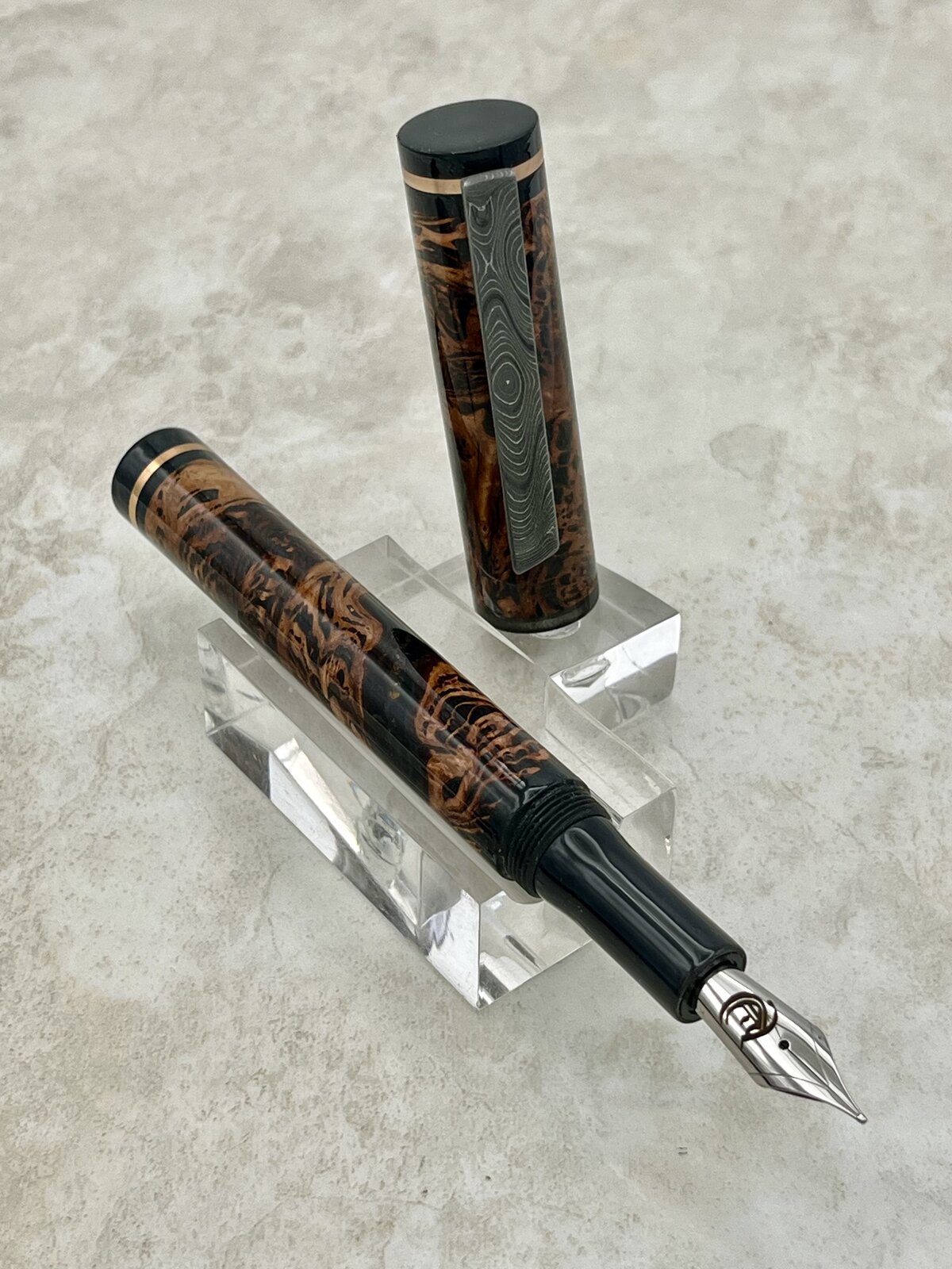 Bronze accent rings and a Damascus clip.