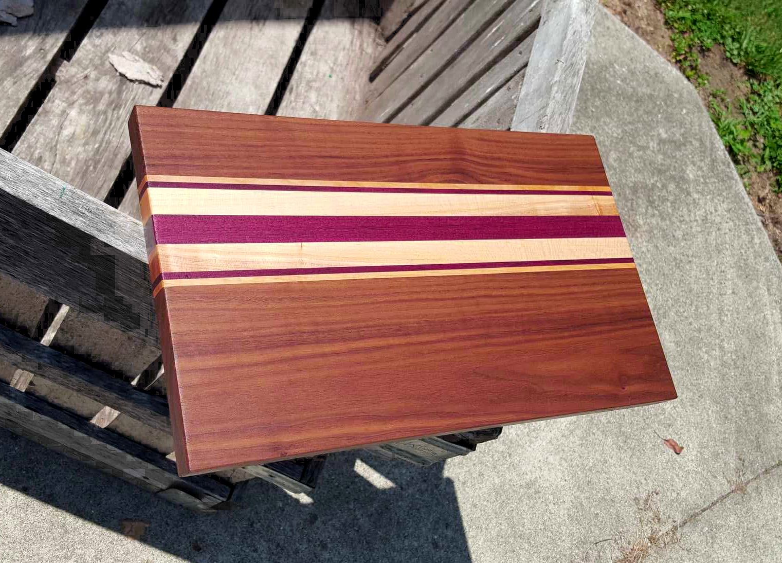 Downsize version of what seems to be my signature style. 16" x 9.75" x 1" Walnut - Maple - Purple Heart