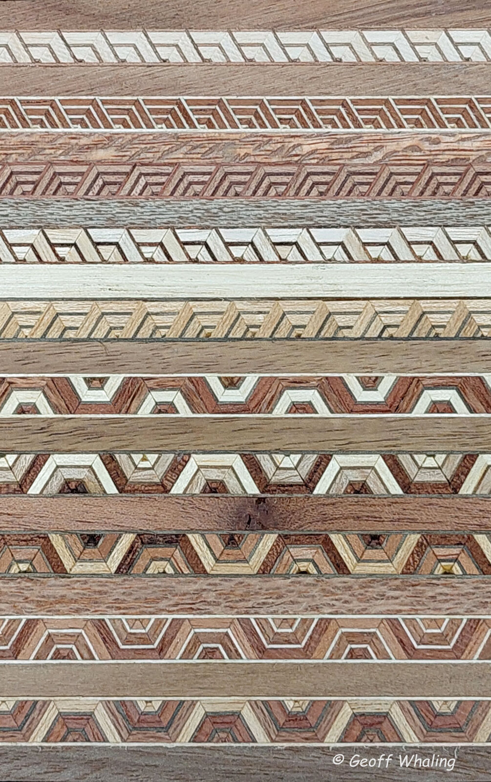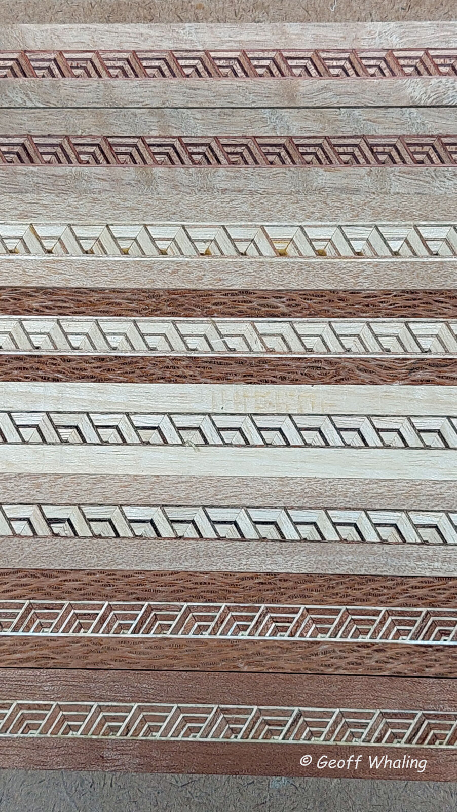 The 1st image is the banding blocks simply stacked with a 6 mm or 1/4" spacer between them to take a photo of them, 2nd photo is with face cheeks laminated on and ready for cutting into blanks. The inlay banding is typically 7 to 8 mm wide or approx 5/16" with the veneers typically 0.6 mm or 0.025".