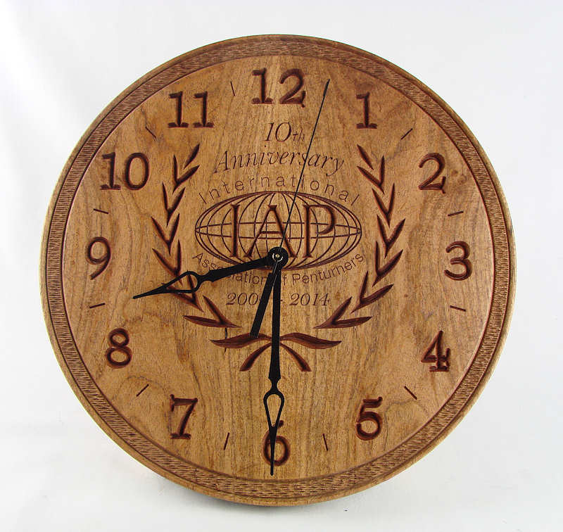 Do you need a new clock for your shop, office, or even living room? Now is your chance to possibly own a piece of IAP history and help keep this site the best on the net! This is a limited edition (only one made for the public) 10th Anniversary IAP wall clock made from Texas Honey Mesquite with the finest of finishes and clock movements.