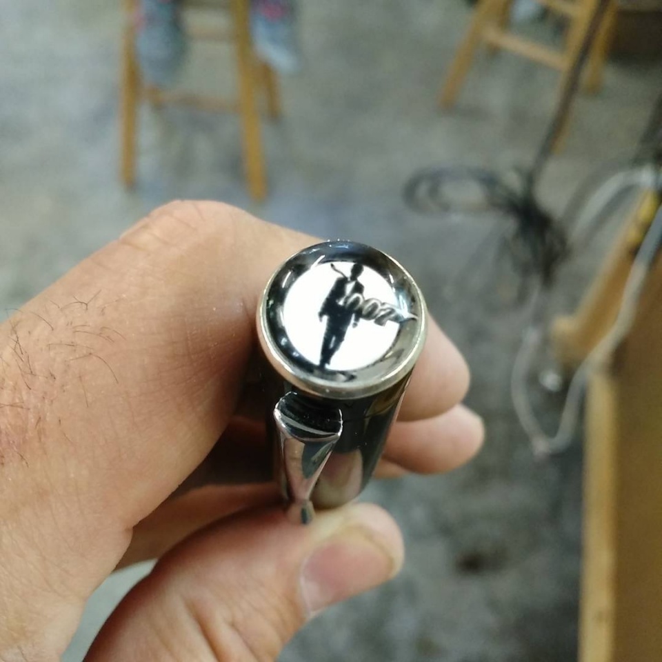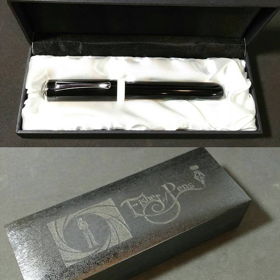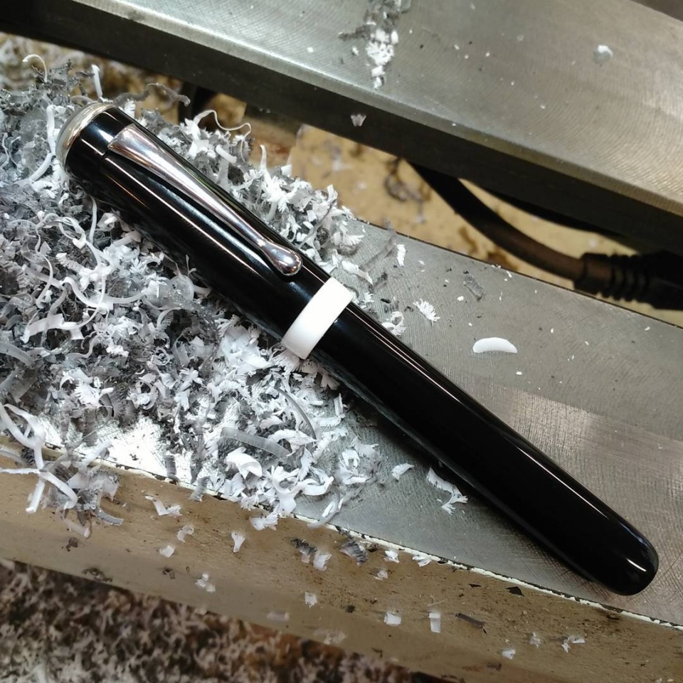 A custom themed pen for one of my customers. He specifically wanted to use the 007 stud earring on the pen somewhere and wanted gloss black body with white trim and matte black grip section.