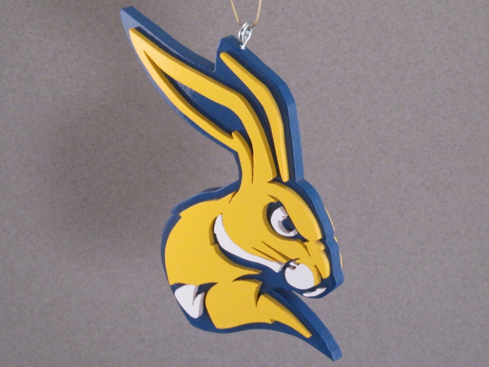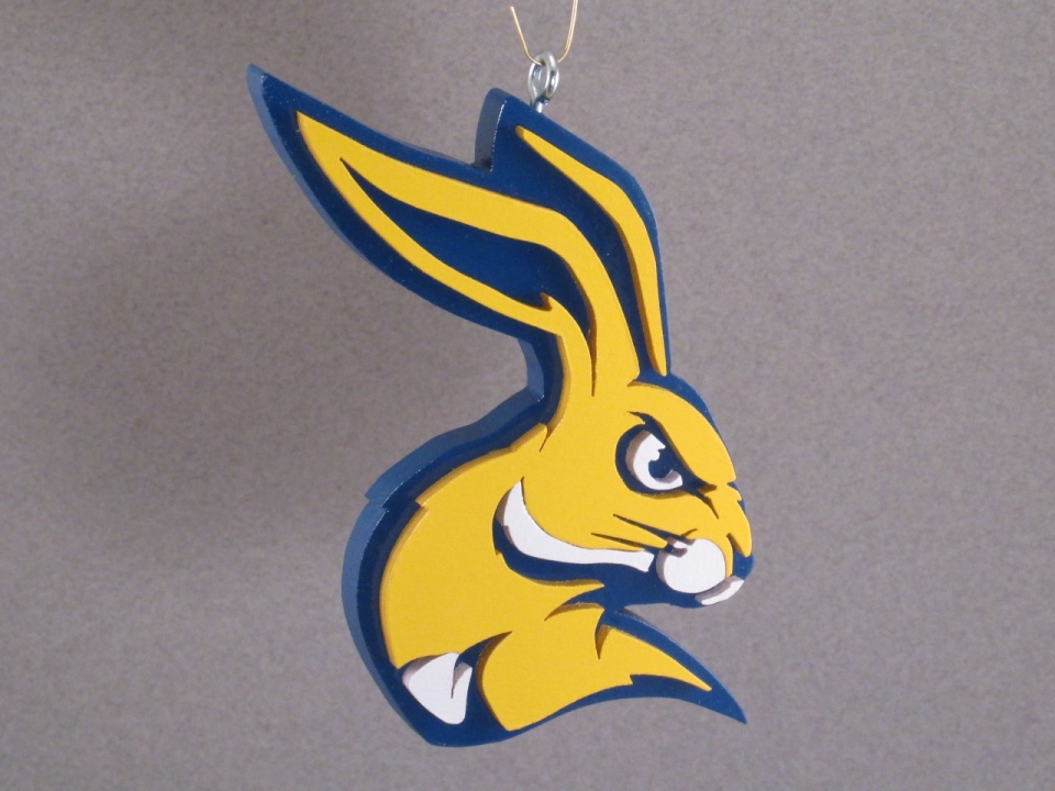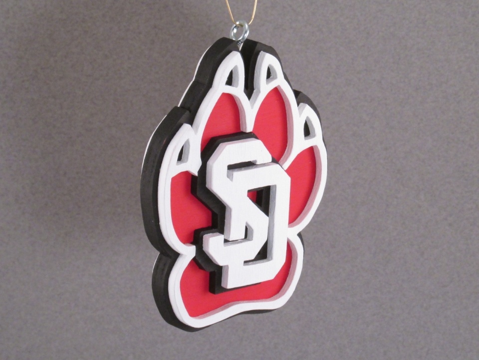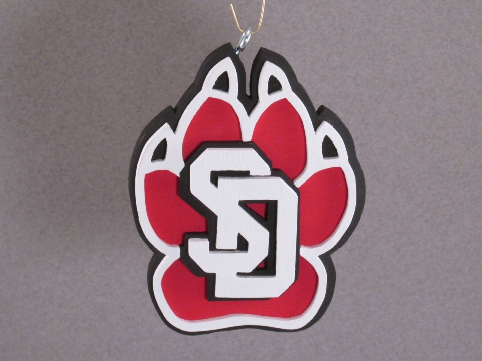 My neighbor has two adult children that I've known for the better part of their lives. The daughter went to and graduated from my alma mater, South Dakota State University. The son, on the other hand, went to and is soon to graduate from the University of South Dakota. USD would very much like to be considered arival to SDSU, but I'm not sure I would put them in that category. Considering them a rival is akin to considering the Washington Generals a rival to the Harlem Globetrotters. This year for Christmas I decided to make each an ornament from their respective schools, however being an SDSU grad I wasn't going to pass up the opportunity to have a little fun at the expense of USD. I made the ornaments, wrapped them in tissue paper and placed them in gift bags. Then I waited for both kids to show up at the same time and I headed over to give them their gifts. I gave the daughter hers first. She opened it,showed off her SDSU ornament (the first two pictures), and thanked me. I then looked at the son and said something to the effect of "Against every moral fiber in my body, I made you one too" and handed him his gift bag. He opened his bag, unwrapped the ornament and revealed another SDSU ornament. Now his parents raised him right, so he feigned graciousness and thanked me halfheartedly. His sister and I were both laughing as I told him I was just kidding and handed him another gift bag telling him "Here's your USD ornament. I've got to be honest with you though. It's not perfect. I started cutting it out and my hand figured out what was going on and kept trying to throw itself into the saw blade. So then I had to start drinking so my hand didn'tknow what was going on. Unfortunately,I must have drank a little too much and the lines got a little crooked. Even though it's not perfect I think I nailed the essence of the USD logo." He opened it, unwrapped the ornament and revealed the ornament in the third picture. He just shook his head as his sister and I laughed. I finally handed him a final gift bag and said "Here, maybe try this one". He hesitantly opened the last bag to reveal the ornament shown in the final three pictures.