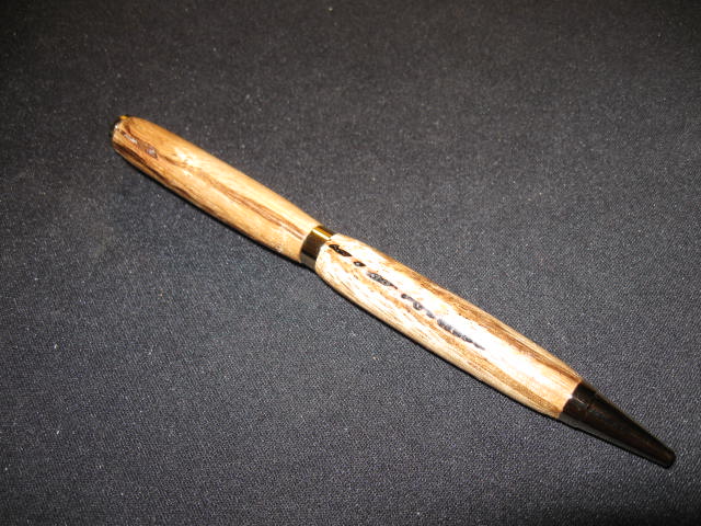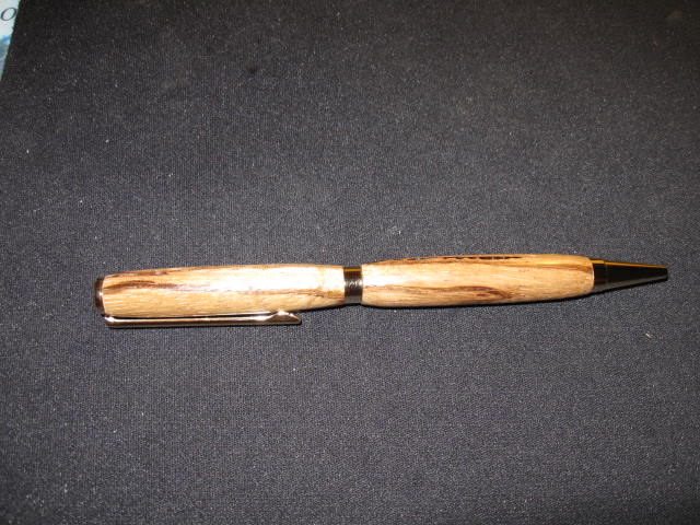 Another first for me I had picked up this blank and noticed it had a couple of small worm trails I think they are in it. As I got nearer to the end I truned it off and it was full of trails, so much so that I thought it was a lost cause. But then I remeber reading somewhere here about making a slurry to fill it in. I took some dust froma black walnut pen I had just sanded and mixed it with CA and packed it in leaving excess on the outside. I let this sit overnight and finished it the next day and feel pretty good about the results. I am getting better thanks to your advice on getting the wood closer to the bushings and it makes a world of difference in the appearance. Let me know what you think. Sorry about the photography I am in the process of working on better pics.