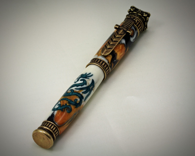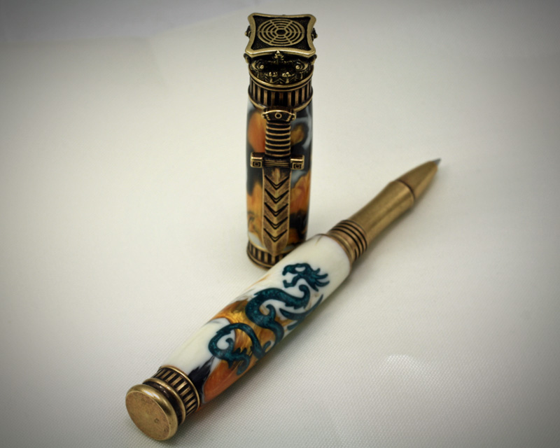 What do the Greek God Zeus and a Mandarin Dragon have in common? Nothing significant that I know of. But I couldn't help but think that one of Masterscrollers Mandarin Dragon blanks would look pretty good on an antique brass Jr. Zeus kit. So I gave it a try!