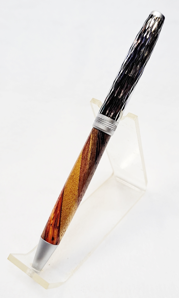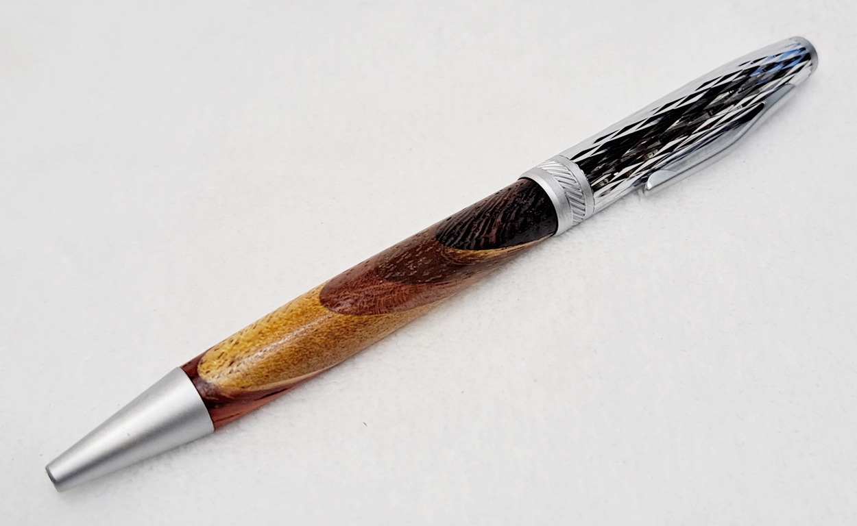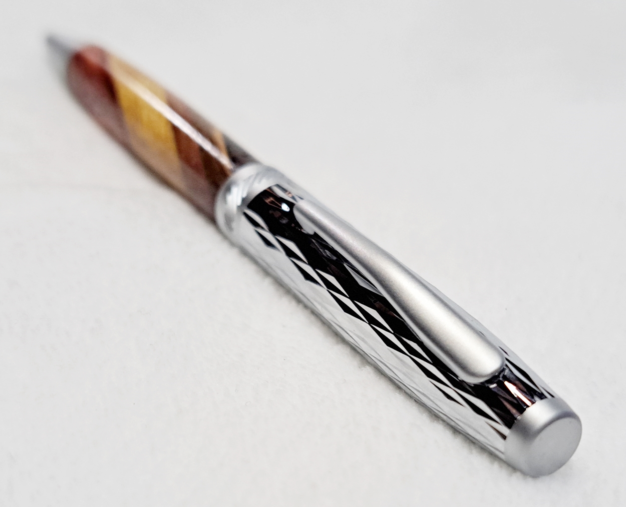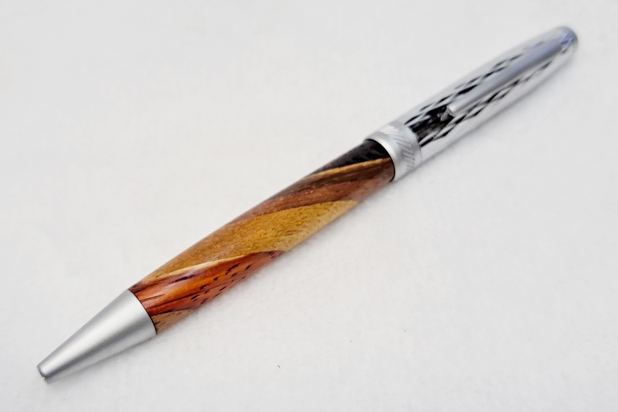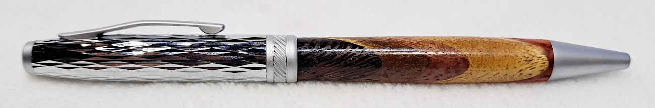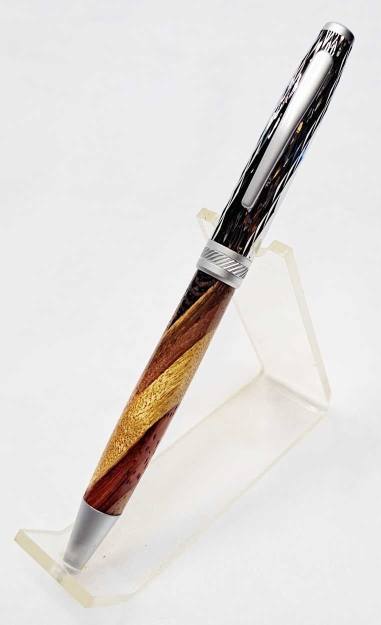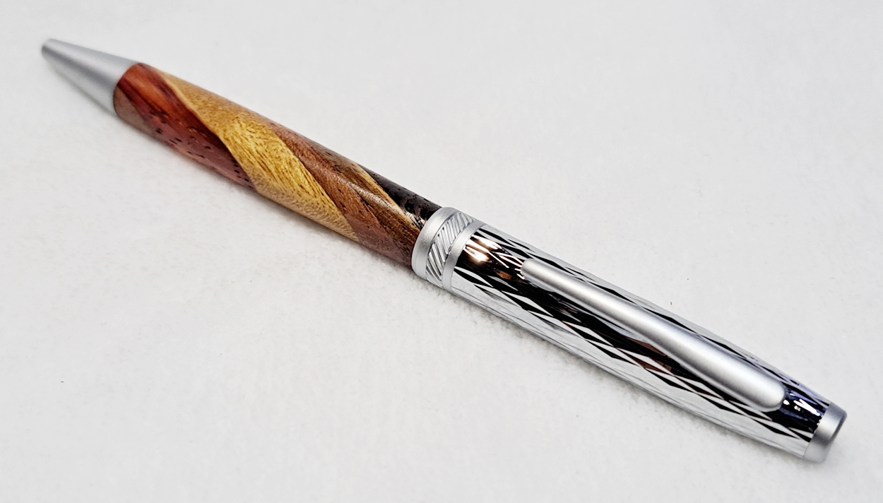 This is a Zigzag twist pen from Woodcraft, in chrome and satin chrome. The laminated blank is also from Woodcraft. The finish is Pens Plus and carnuba wax.
