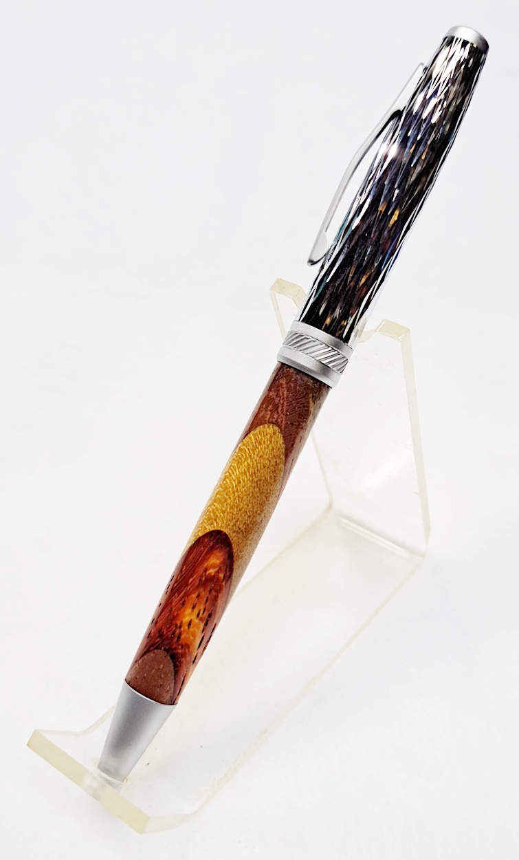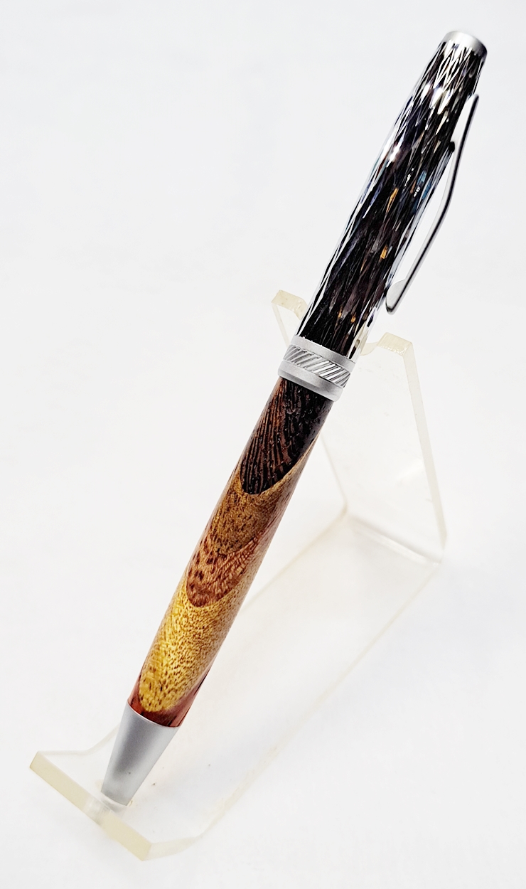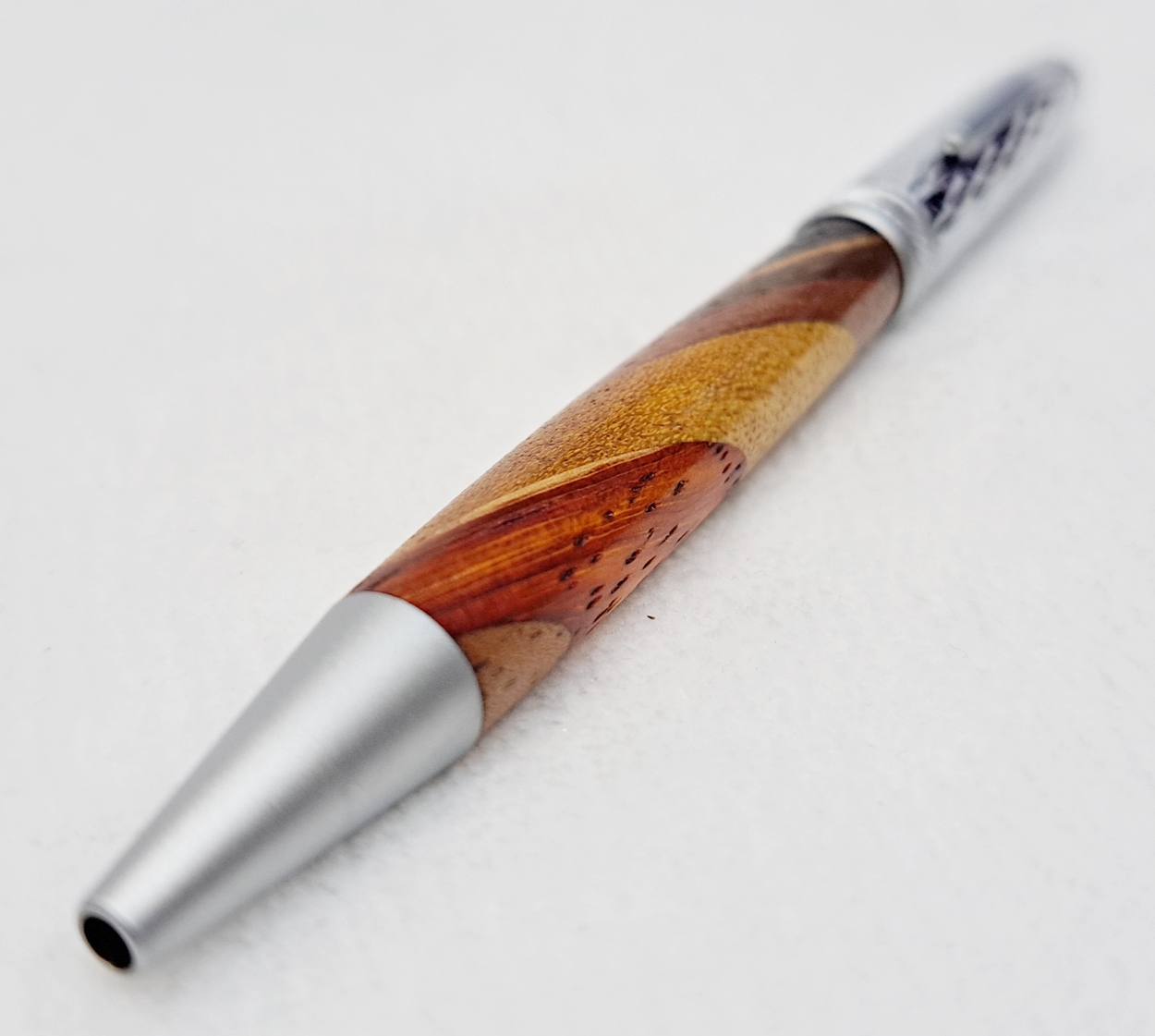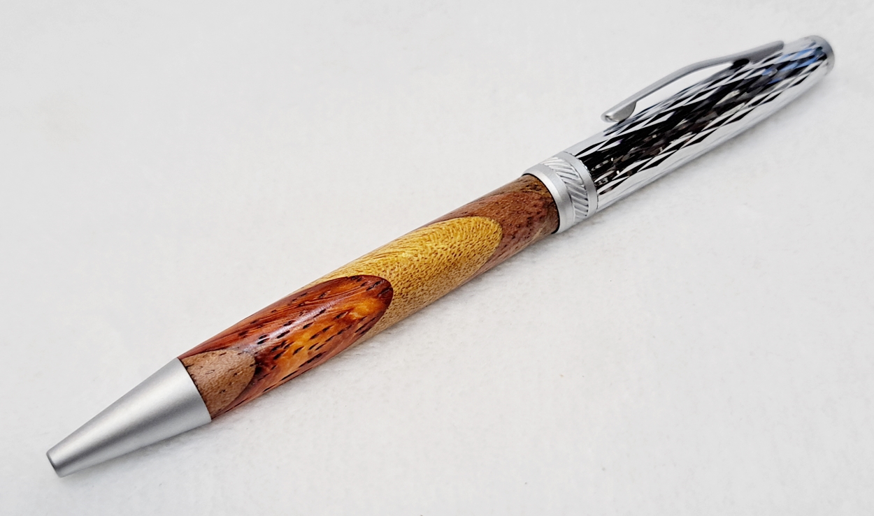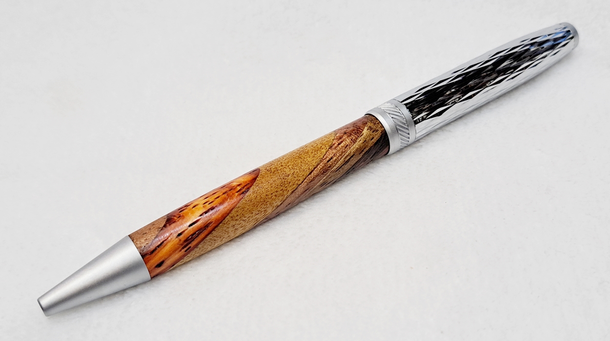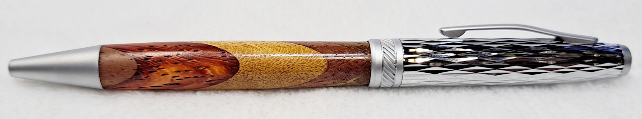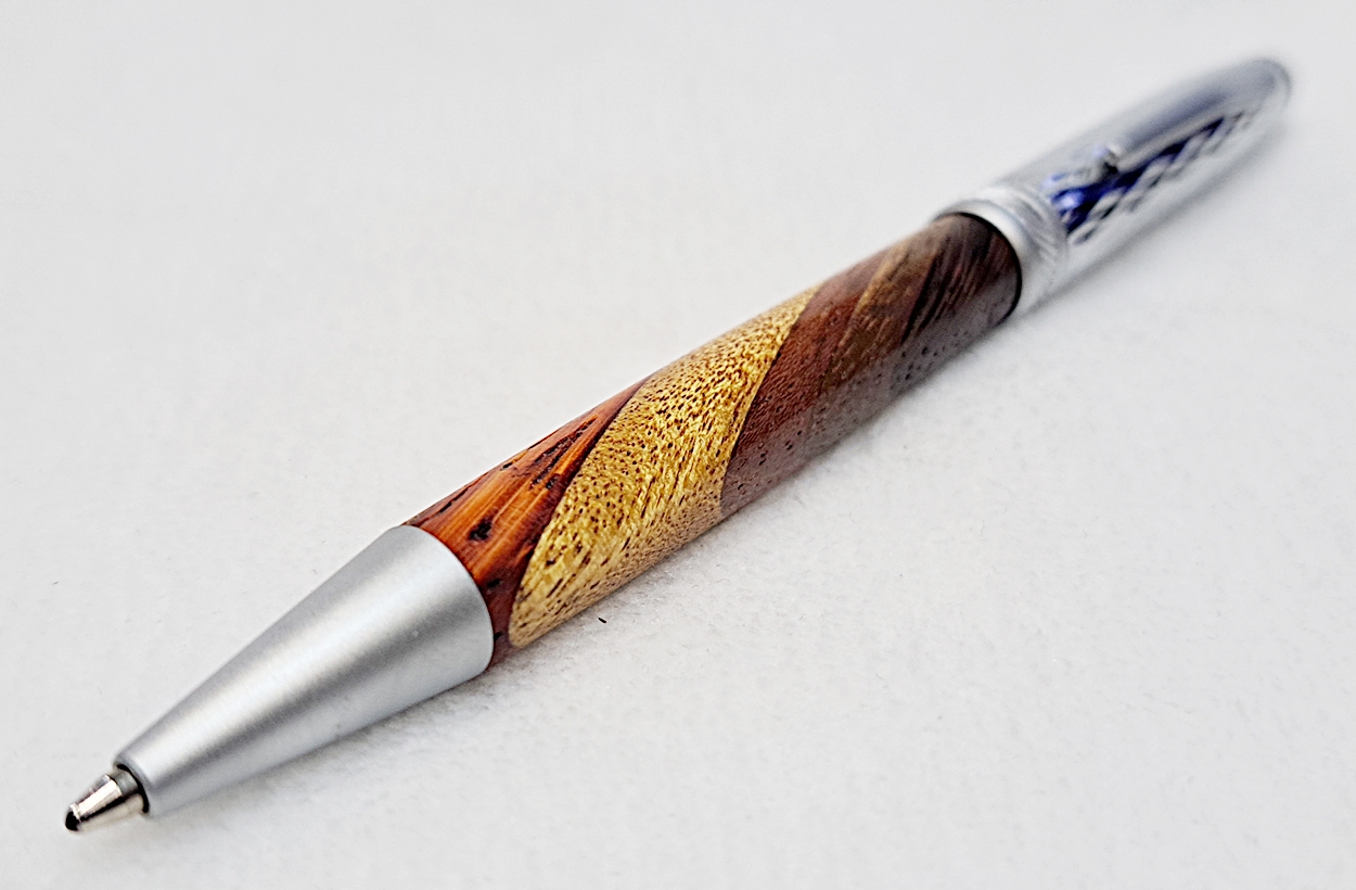 This is a Zigzag twist pen from Woodcraft, in chrome and satin chrome. The laminated blank is also from Woodcraft. The finish is Pens Plus and carnuba wax.