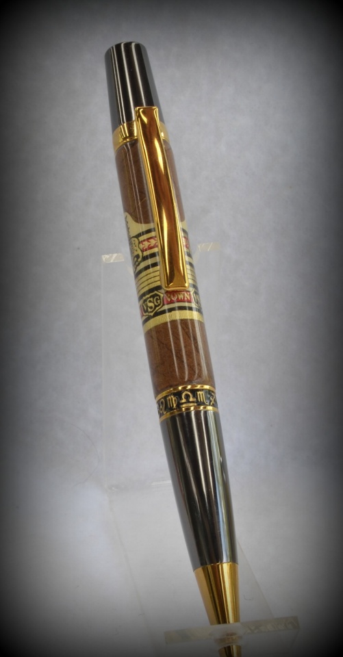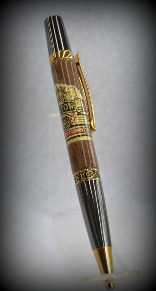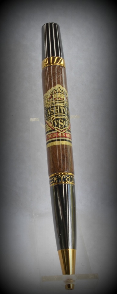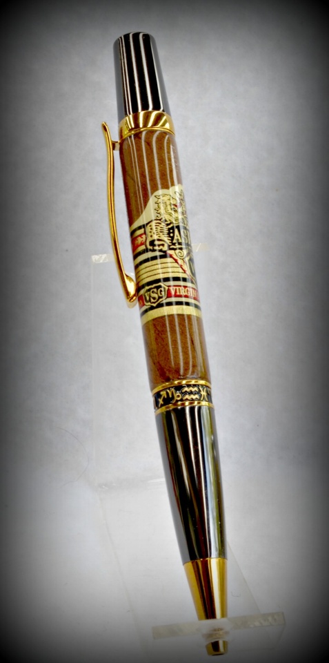 ....this is my first attempt at a realistic faux Cigar pen. I experimented with quite few different types of material for the background and this is the closest to looking like natural tobacco leaves as I could obtain. To me it appears that one can actually see the veins in the leaves, and I like that aspect. It was cast sans pressure in Silmar. I used some Cigar rings I purchased from ?? ( cannot remember) CRS kicked in, a IAP member. The Zodiac kit is much nicer, to me at least, than the Mesa and the tranny is easily changed or replaced IF need be. I'll use it again I am quite sure. C~N~C are welcome. Thanks and be well....Jan